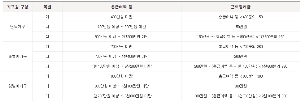 근로장려금은 거주자를 포함한 1세대의 가구원 구성에 따라 정한 부부합산 총급여액 등을 기준으로 지급되며, 연간 최대 지급액은 300만원입니다. 근로장려금 지급 기준이 되는 소득 상한 금액이 2022년부터는 200만원씩 상향되어 더 많은 국민들이 혜택을 볼 수 있게 되었습니다.