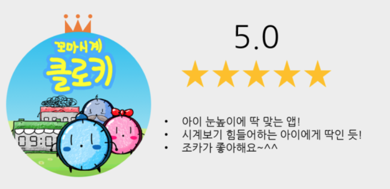 시계 읽기를 재미있게 공부할 수 있는 교육용 앱 꼬마시계 클로키는
