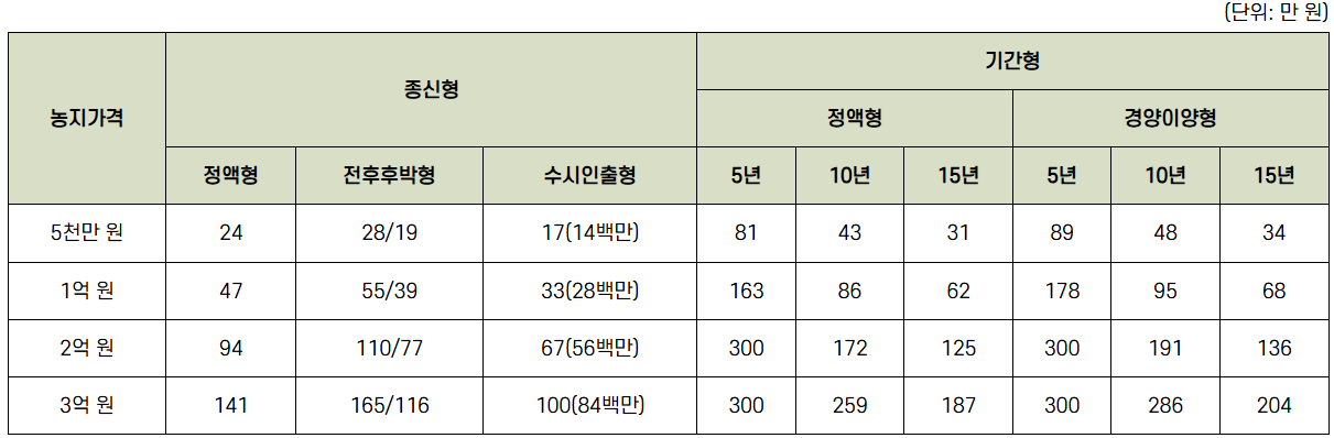 - 지급액은 농지의 평가액, 가입자의 연령, 선택한 지급 방식에 따라 달라집니다.