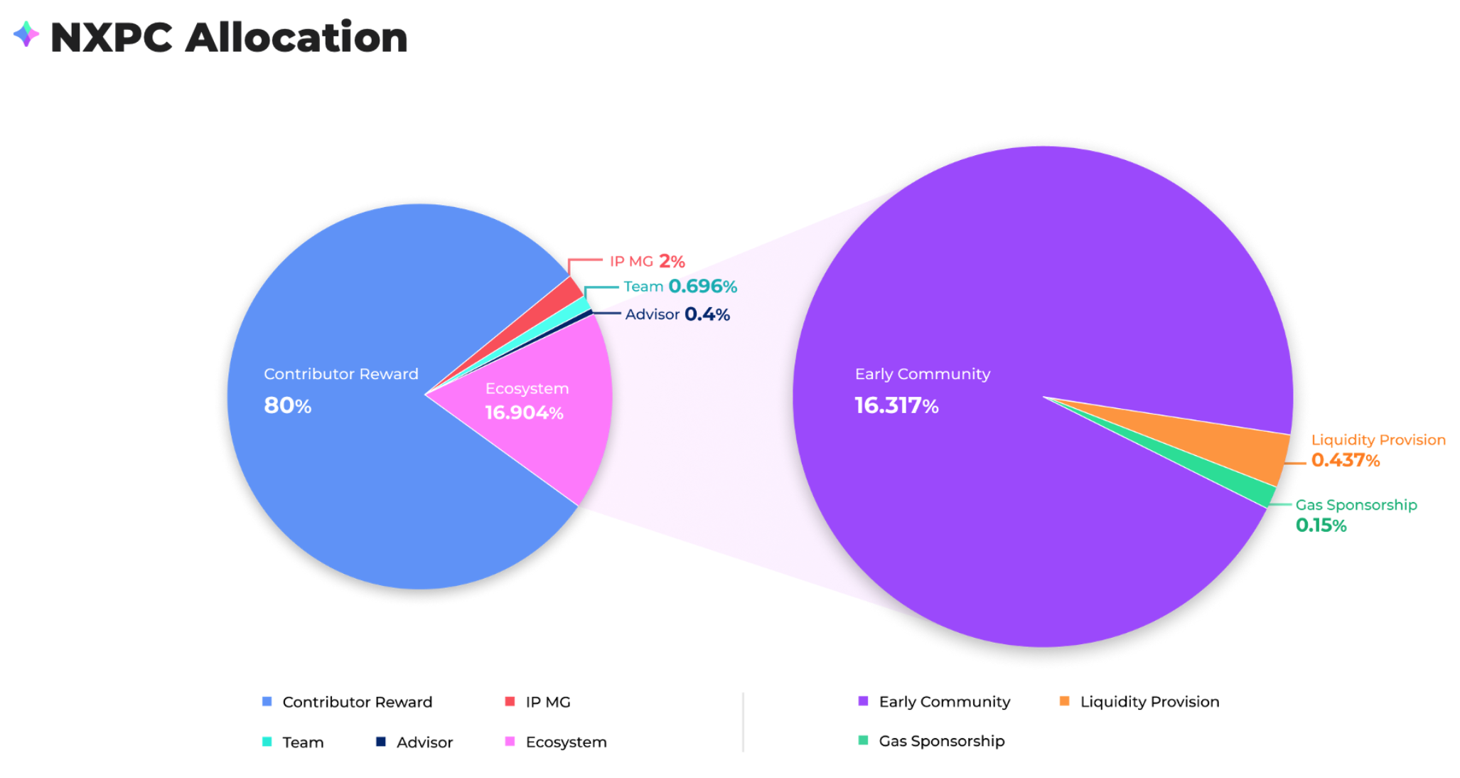 총 10억개가 발행될 예정인 NXPC의 토크노믹스는 철저하게 커뮤니티와 생태계 활성화에 초점을 두고 있습니다. 전체 물량의 97%가 커뮤니티와 생태계 기여자에 할당함으로써 업계를 놀라게 한 점은 그 의지를 엿볼 수 있게 합니다.