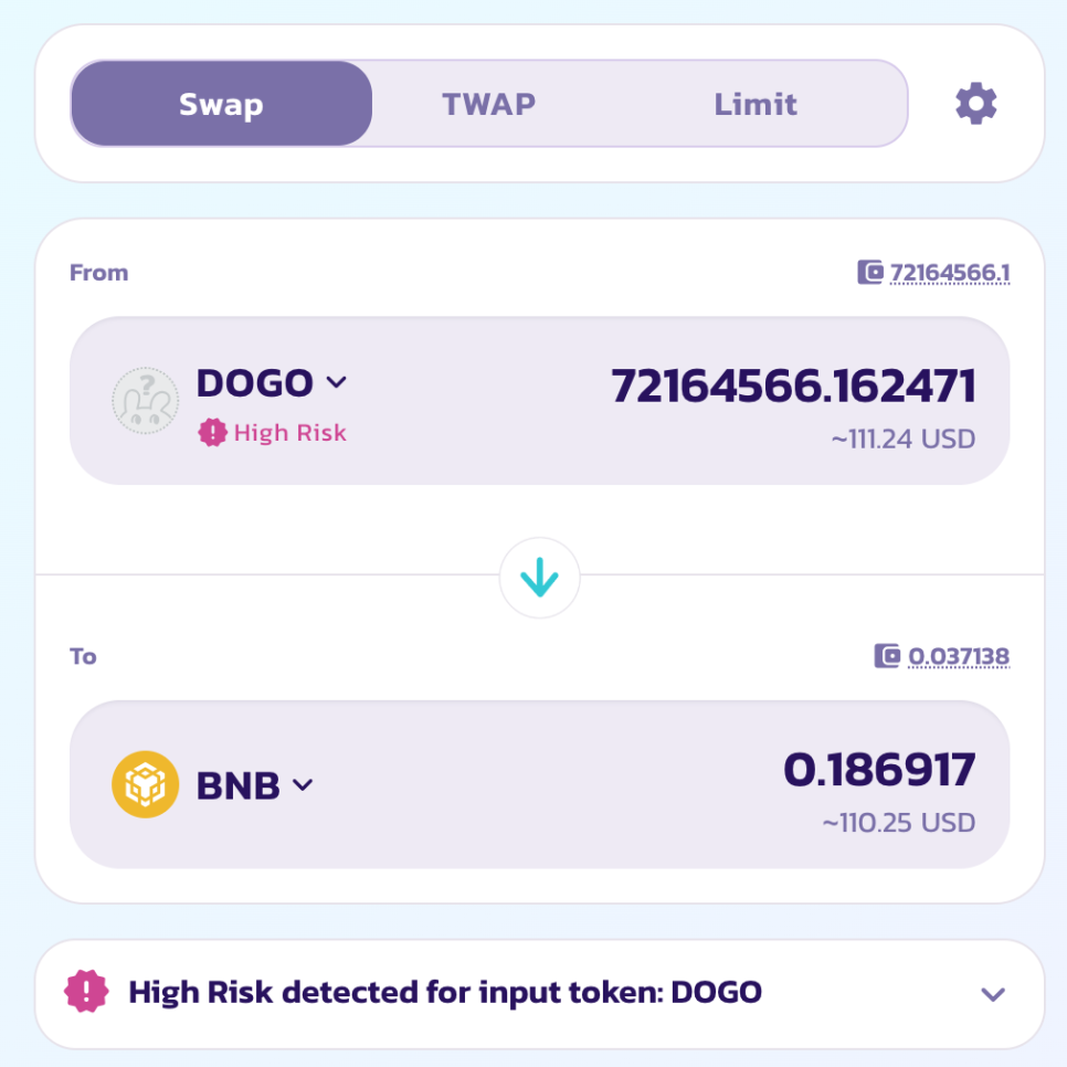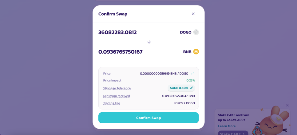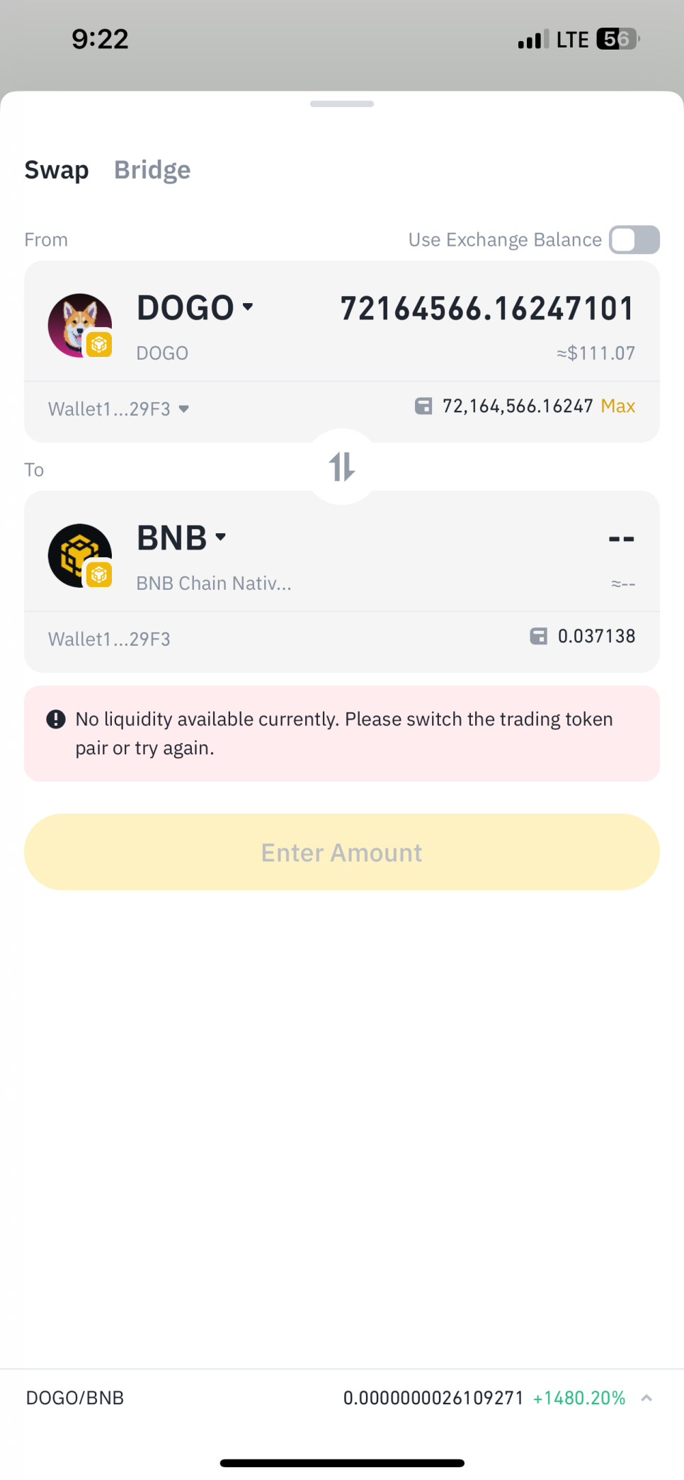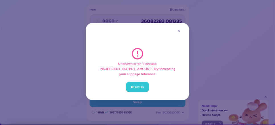 그 결과 DOGO/BNB 유동성이 부족해 스왑할 수 없다는 메시지가 출력됩니다.