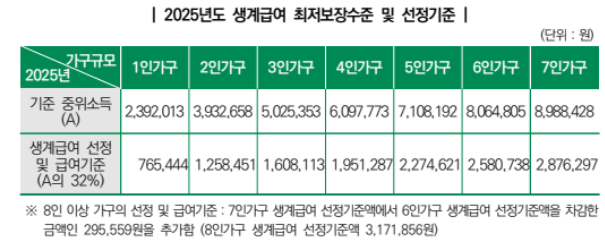 - 가구의 소득인정액(실제 소득 + 재산의 소득환산액)이 선정기준(기준 중위소득 32%)을 초과하면 대상에서 제외됩니다.