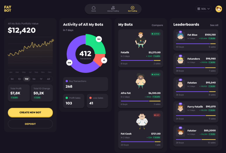FatBot의 핵심 기능 중 하나는 Sniping 2.0입니다. 이 기능은 새로운 코인이 출시될 때 초기 단계에서 빠르게 진입하여 높은 수익을 창출하는 것이 주요 목표입니다. FatBot은 Solana, Base, Binance Smart Chain(BSC) 등 다양한 블록체인 네트워크를 지원하며, 거래량 증가나 주소 성장과 같은 성공의 초기 신호를 탐지해 빠르게 대응할 수 있게 해줍니다.