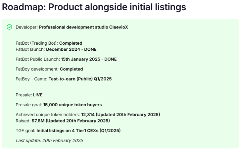 FatBot ($FATTY)는 혁신적인 기술과 독특한 생태계를 통해 암호화폐 거래 시장에서 강력한 입지를 구축하려 하고 있습니다. 특히 사전 판매를 통해 초기 투자자들에게 매력적인 기회를 제공하며, 스나이핑 2.0, FatBoy Game, $FATTY 스테이킹, 그리고 추후 런칭될 FATTY Analysis와 FattyStore는 기대감을 주고 있습니다. Web3 프로젝트 경험이 많은 개발사와 협업하는 부분도 안정성을 더해주고 있습니다.