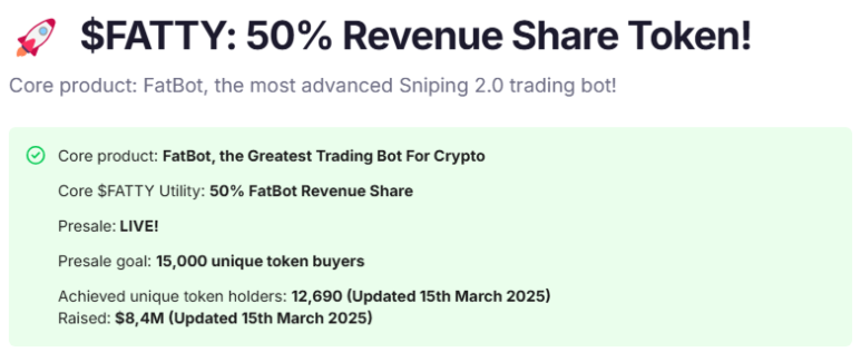 FatBot ($FATTY)는 암호화폐 생태계에서 혁신적인 자동화 거래 봇과 독특한 수익 공유 모델을 통해 주목받고 있는 프로젝트입니다. 특히 Sniping 2.0 전략과 FatBoy 게임 등 다양한 생태계 요소를 통해 사용자 경험을 강화하고 있습니다. 이 글에서는 FatBot의 주요 특징, 생태계 구조, 투자 기회, 그리고 $FATTY 토큰의 사전 판매(presale)에 대해 분석합니다.