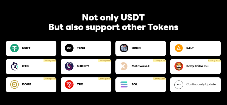 기본적으로 USDT 기반으로 운영되지만, 솔라나(Solana), 트론(Tron), 도지(Dogecoin) 등 다양한 암호화폐의 잔액도 사용 가능합니다.