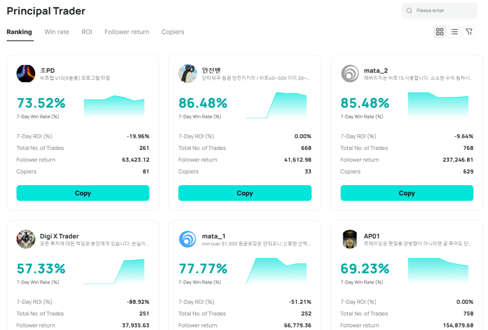 보통은 좋은 수익률을 기록한 트레이더를 선택해 거래를 연동하며, 해당 트레이더가 공개 설정을 해둔 경우, 팔로워는 그의 거래 내역을 실시간으로 확인하고 학습할 수도 있습니다.