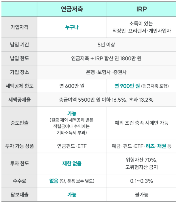- 연금저축(600만 원 한도) + IRP(900만 원 한도) → 총 1,800만 원까지 세액공제 가능