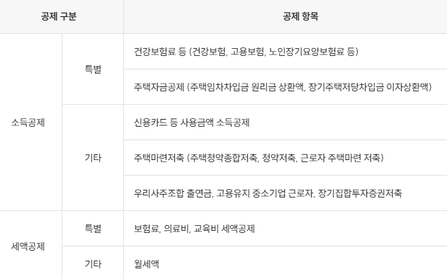 - 인적공제, 연금보험료 공제, 주택자금 공제, 신용카드 사용액 등