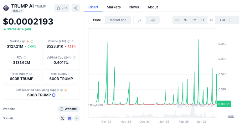 현재 $TRUMP의 가격은 약 $0.0002193 (한화 약 0.3원), 시가총액은 약 $127M (약 1,860억 원), 24시간 거래량은 $523K (약 8억 원) 수준입니다. 1주일 단위로 펌핑과 덤핑이 반복되고 있는 상황입니다. 여러분의 생각은 어떠신가요? 이 거인의 어깨 위에 올라타는 것이 좋을까요, 아니면 무시하는 것이 좋을까요?
