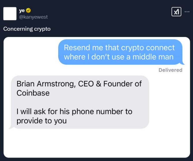 칸예 웨스트, 코인베이스 CEO와의 직접 접촉을 원하다