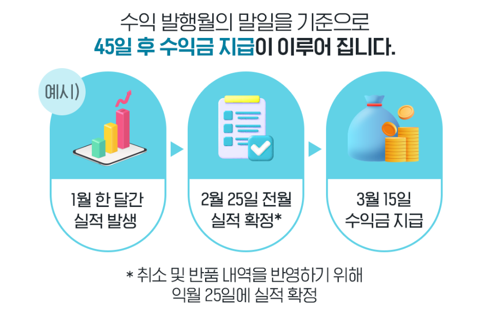 • 수익은 매월 정산되어 최소 지급 기준 1만 원을 넘으면 등록한 계좌로 지급됩니다.