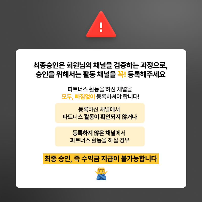 • 약관 위반 활동이 확인되면 수익금 지급이 중지되고 회원 자격을 상실할 수 있으니 주의가 필요합니다.