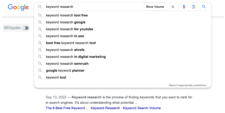 Google 검색창의 자동 완성을 활용하는 것은 키워드 및 주제 아이디어에 매우 적합합니다. 콘텐츠에서 다룰 수 있는 아직 활용되지 않은 키워드를 보여줍니다. 이러한 제안은 인기 검색어 검색어와 관련이 있습니다. 따라서 이러한 키워드로 콘텐츠를 최적화하면 관련 검색 결과에 유리한 위치를 확보할 수 있습니다.