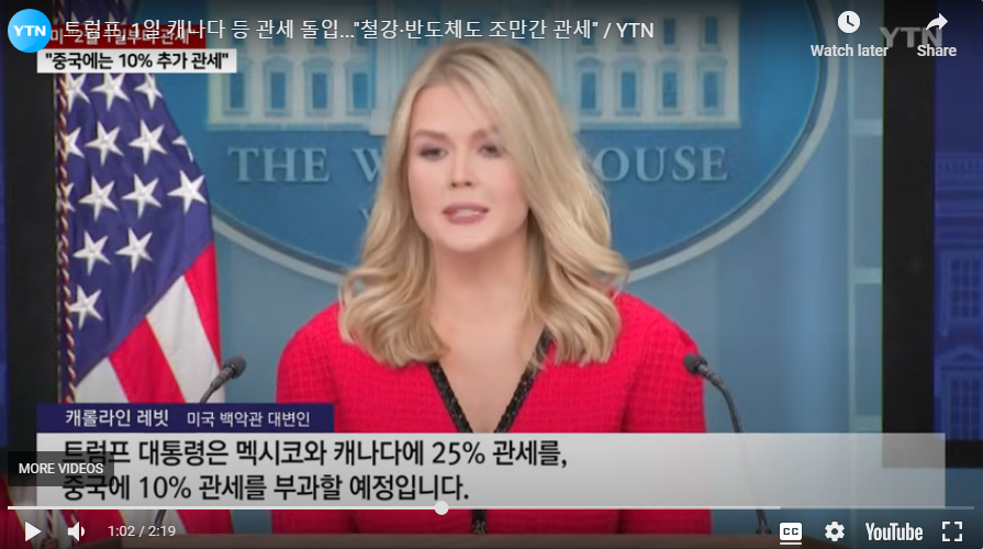 캐롤라인 레빗 백악관 대변인에 따르면, 미국은 2025년 2월 1일부터 멕시코와 캐나다에 25%, 중국에 10%의 추가 관세를 부과합니다. 이는 미국의 주요 무역 적자국들을 대상으로 하는 조치입니다. 관세 인상은 인플레이션을 악화시키고 세계 경제 성장률을 둔화시킬 수 있기에 전 세계의 관심이 되고 있습니다. 트럼프 관세에 대한 자세한 내용을 확인해겠습니다.