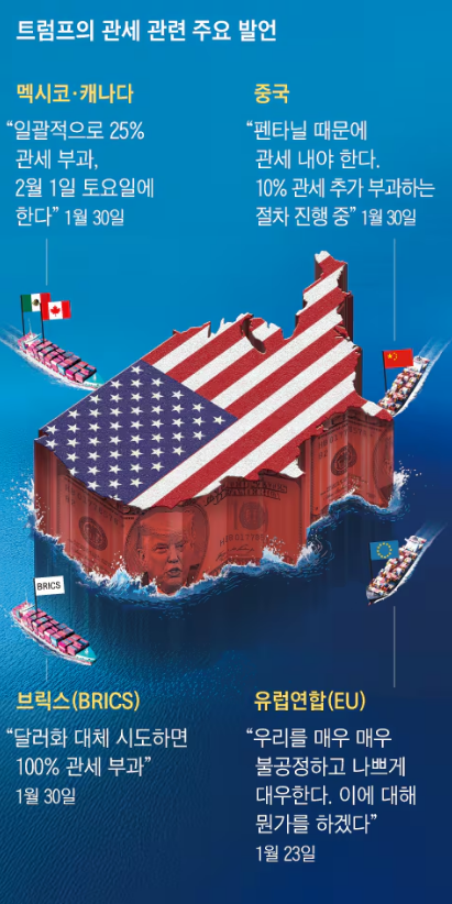 - 트럼프는 2월 1일부터 멕시코와 캐나다에 25%, 중국에 10%의 추가 관세를 부과하겠다고 밝혔습니다.