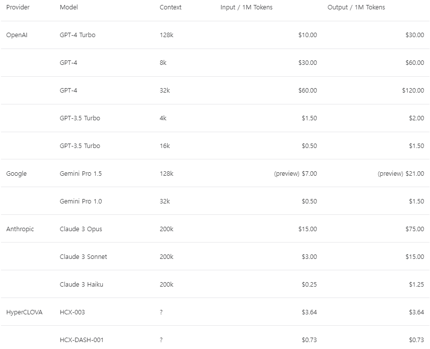 아래는 중국 외의 AI 서비스 가격 정책을 정리한 표입니다.