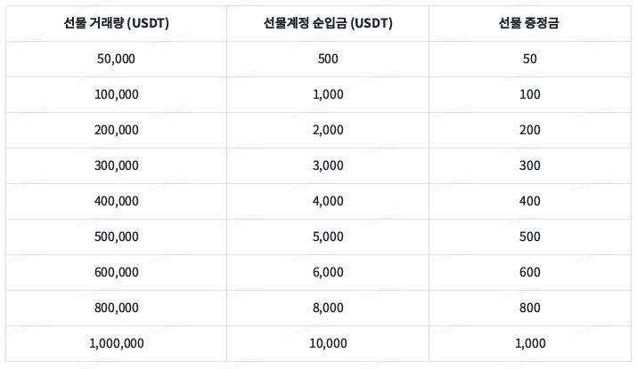 (예: $10,000 입금 후 선물 거래량 $1,000,000 달성시 $1,000 지급)