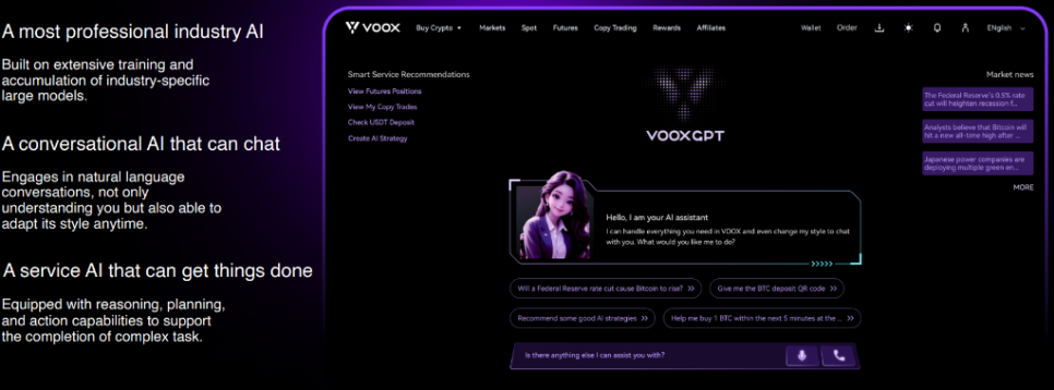 특징적인 부분은 인공지능(AI) 기반의 맞춤형 암호화폐 거래 플랫폼이라는 점입니다. 인공지능이 대규모 데이터 시물레이션을 거쳐 추론, 계획, 실행하는 최적의 서비스 제공을 목표로 하고 있으며, 그 노력의 일환으로 2025년 3월 14일 ‘VOOX Labs’를 출범하기도 했습니다.