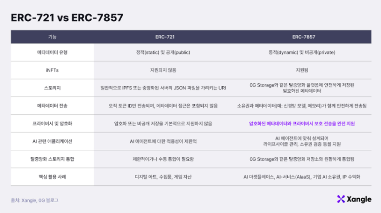 0G Labs는 AI 에이전트를 안전하게 소유·거래하기 위해 ERC-7857이라는 새로운 NFT 표준을 개발하고 있습니다. 기존 NFT(ERC-721, ERC-1155 등)와 달리, AI 모델의 지속적인 학습 및 진화를 반영할 수 있는 동적 데이터 저장 구조를 제공합니다.