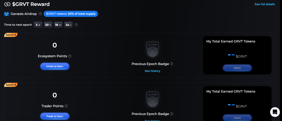 리워드 프로그램은 전체 GRVT 토큰 공급량의 20%를 구성하며 보상이 소진될 때까지 토큰 보상을 누적할 수 있습니다.