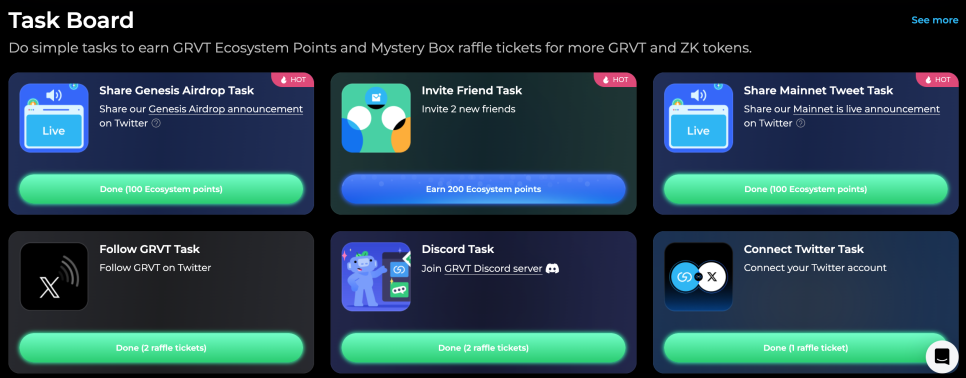 초기 단계이기에 다양한 보상 프로그램을 운영하며 사용자의 참여를 유도하고 있습니다. GVRT 보상 프로그램과 ZK 보상 프로그램이 그것입니다. 아래는 보상 프로그램에 대한 자세한 정보입니다.