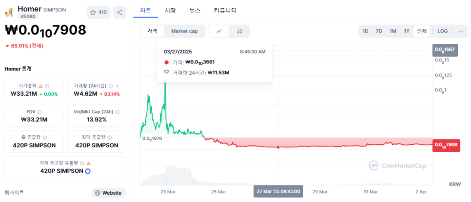 하지만 밈코인 중에는 의도적으로 초기에 덤핑하는 러그풀도 존재하기에 주의할 필요가 있습니다. 아래는 상장 직후 덤핑하여 가격이 절벽을 만들며 하락한 사례입니다.