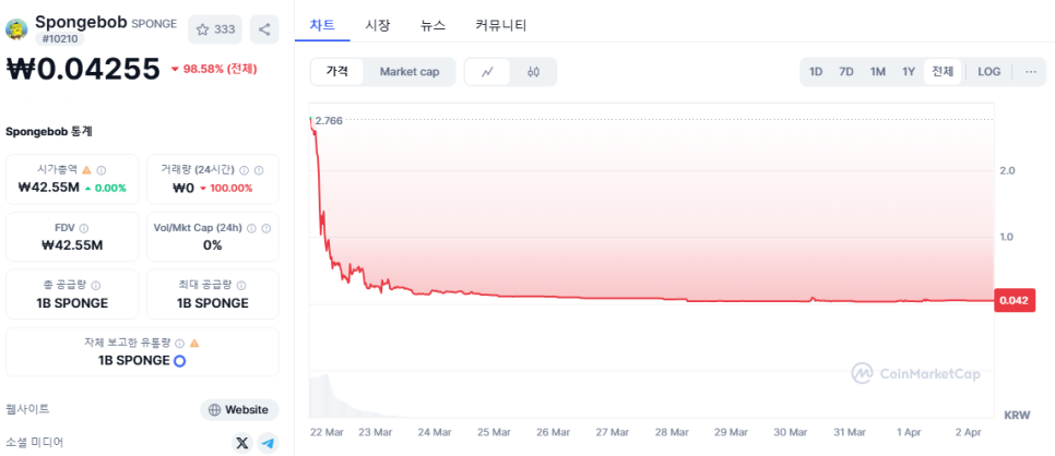 하지만 밈코인 중에는 의도적으로 초기에 덤핑하는 러그풀도 존재하기에 주의할 필요가 있습니다. 아래는 상장 직후 덤핑하여 가격이 절벽을 만들며 하락한 사례입니다.